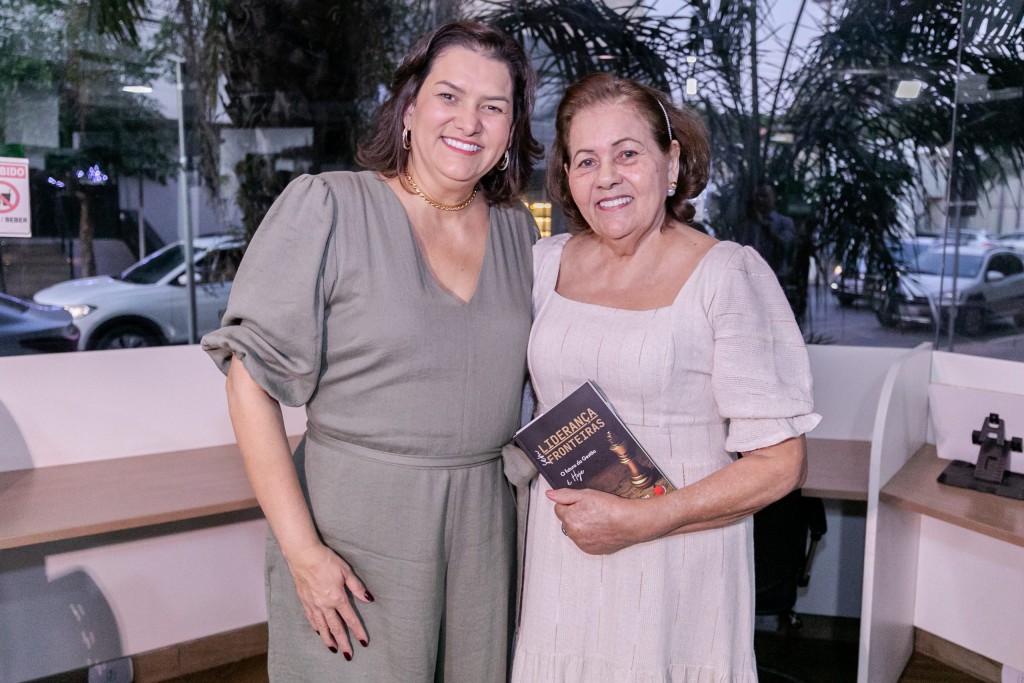 A foto ilustra a autora do livro, Sônia Regina Guimarães da Fonseca, vestida com roupa cinza. Ao lado, está a professora aposentada Creuza Guimarães, que usa vestido branco. Ambas estão sorrindo e exibindo o livro “Liderança sem Fronteiras – O futuro da Gestão é Hoje”