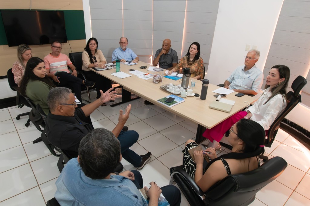 A foto mostra uma reunião sendo realizada em sala ampla, com vários participantes em volta da mesa de madeira comprida. Entre os participantes estão o secretário Municipal de Meio Ambiente de Cuiabá, José Afonso Portocarrero e a secretária Municipal de Ordem Pública, Juliana Palhares. Sobre a mesa estão papeis e copos com água, garrafa de café e um pote com balas. A imagem transmite um ambiente saudável de discussões produtivas.