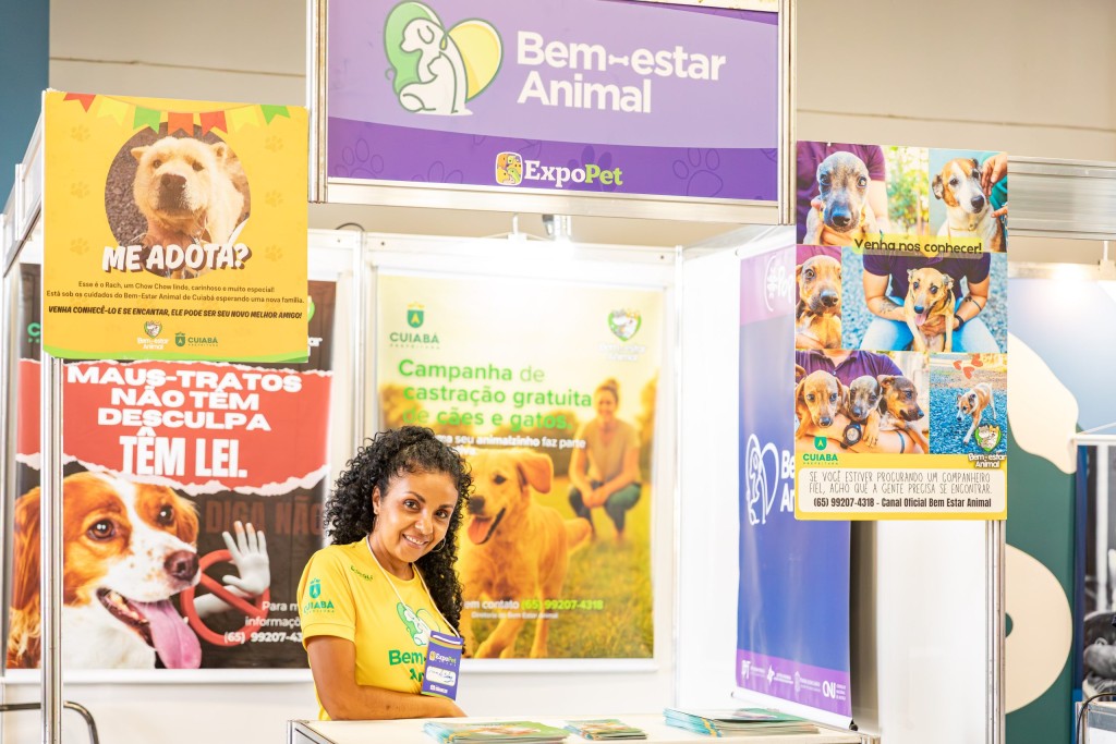 A foto mostra o espaço da Expopet decorado com informações sobre o trabalho realizado pela Prefeitura de Cuiabá, por meio da Bem-Estar Animal, com uma das veterinárias da equipe em destaque.