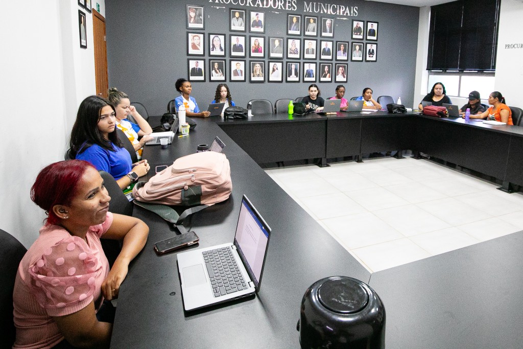 A imagem mostra o momento do curso de assistente administrativo realizado por meio de uma parceria entre a Secretaria da Mulher e o Senac. Os alunos estão sentados e usando notebooks para aula prática de elaboração de documentos, contratos, atestados e atas.