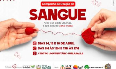 A Prefeitura de Lucas do Rio Verde, o Centro Universitário Unilasalle e o MT Hemocentro realizam nos dias 14, 15 e 16 de abril uma Campanha...