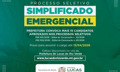 A Prefeitura de Lucas do Rio Verde divulgou nesta quinta-feira (09), dois novos editais de convocação de aprovados, nos Processos Seletivos Emergenciais n. 001/2026 e 002/2026....