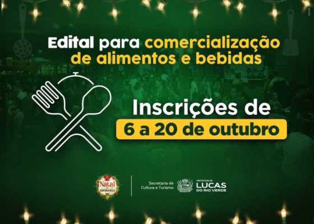 A Prefeitura de Lucas do Rio Verde, por meio da Secretaria Municipal de Cultura e Turismo, informa que estão abertas as inscrições do Edital Nº 06/2025, que trata da comercialização de alimentos e bebidas na Praça de Alimentação do Natal da Esperança 2025.