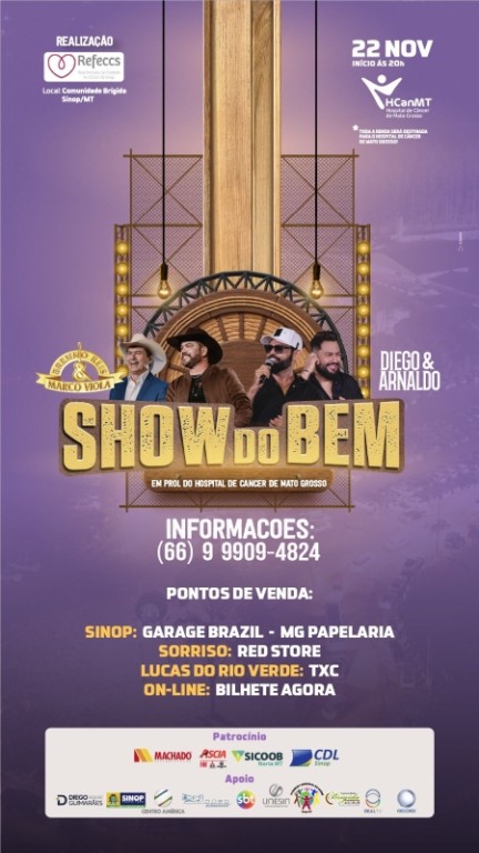 A Prefeitura de Sinop, por meio da Secretaria de Saúde, em parceria com a Rede Feminina de Combate ao Câncer de Sinop (Refeccs) realizará, no dia 22 de novembro, o primeiro Show do Bem. O evento beneficente que terá toda a renda revertida ao Hospital de Câncer de Mato Grosso (HCAN), terá a presença das duplas sertanejas Breno Reis e Marco Viola, e, Diego e Arnaldo. A festa acontecerá na Comunidade Brígida, a partir das 20h, e promete uma noite de solidariedade, música e emoção.