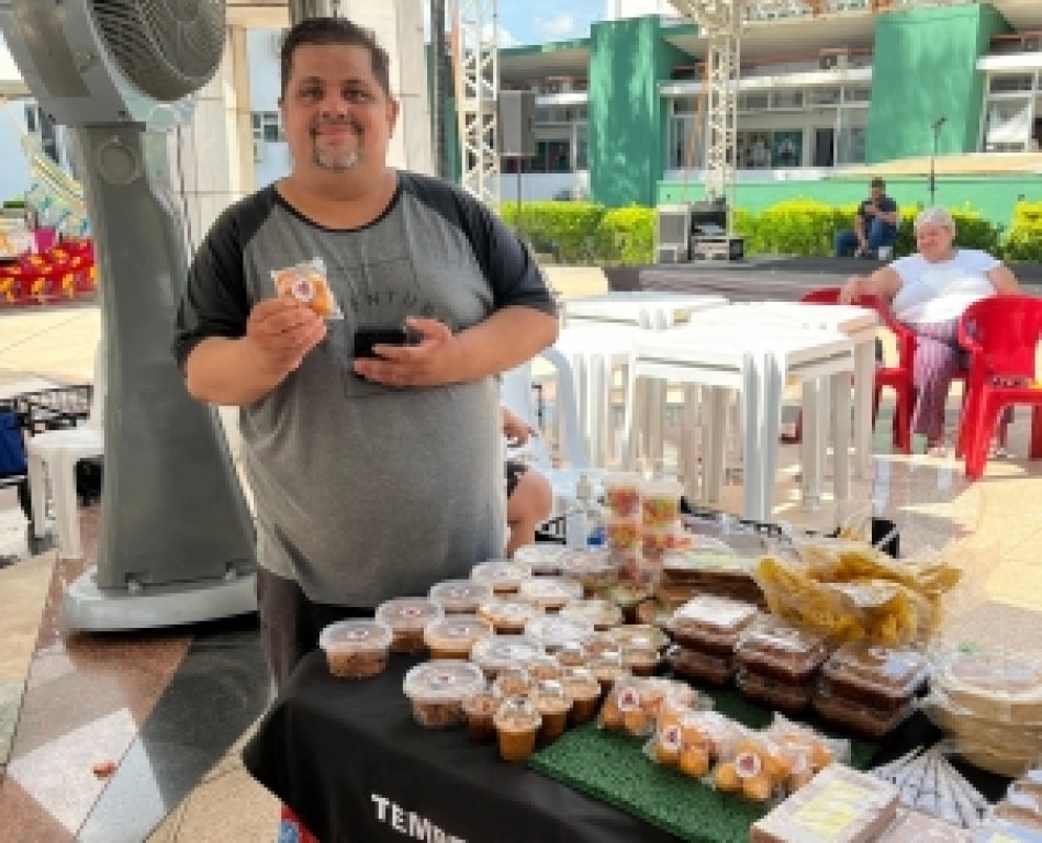 Para o comunicador Carlos Fernandes, que participa pela primeira vez da feira, a venda de doces caseiros tradicionais da Baixada Cuiabana foi além do aspecto financeiro: tornou-se uma válvula de escape para a saúde mental.