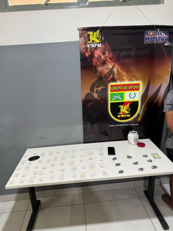 Na terceira ocorrência do dia, o GAP do 4º Batalhão flagrou um homem pilotando uma motocicleta Biz em alta velocidade, no bairro Canelas. Diante da situação, os policiais iniciaram acompanhamento e conseguiram abordar o suspeito. Na revista pessoal, os militares encontraram 50 porções de maconha.