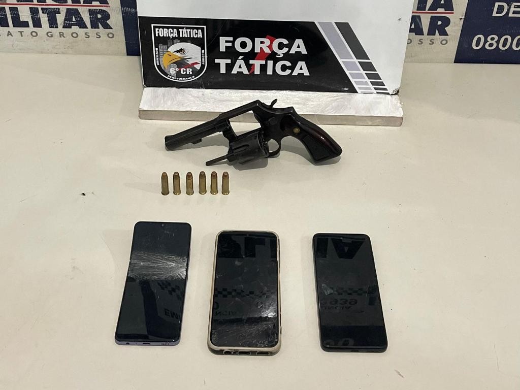 A Polícia Militar prendeu três homens faccionados, com idades entre 19 e 33 anos, por porte ilegal de arma de fogo, na madrugada desta quinta-feira (18.9), em Cáceres. Os suspeitos foram presos em flagrante ao confessar que iriam cometer um homicídio contra um faccionado rival. Com eles, a PM também apreendeu um revólver e munições.