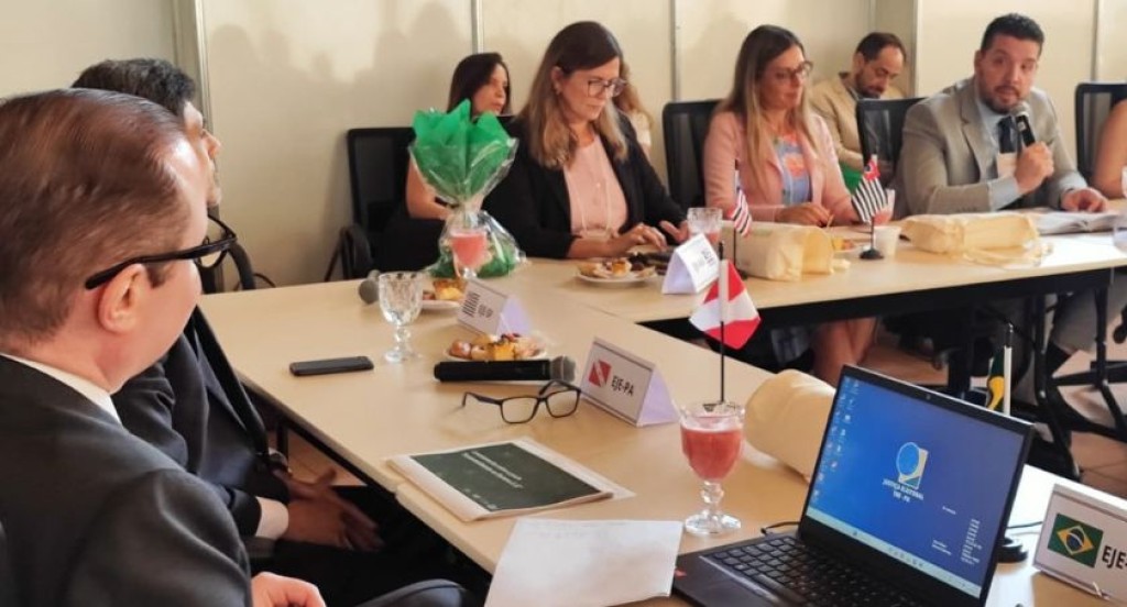 #PraTodosVerem: A imagem mostra uma reunião formal com várias pessoas sentadas ao redor de uma mesa. Há notebooks, documentos, microfone e pequenas bandeiras que representam instituições participantes, incluindo uma com identificação da EJE-TSE. De perfil, à esquerda, aparece o ministro do STF, Cristiano Zanin, e do outro lado, à direita da foto, está o juiz-membro do TRE-MT, Raphael Arantes, com o microfone na mão, apresentando a iniciativa ao ministro.