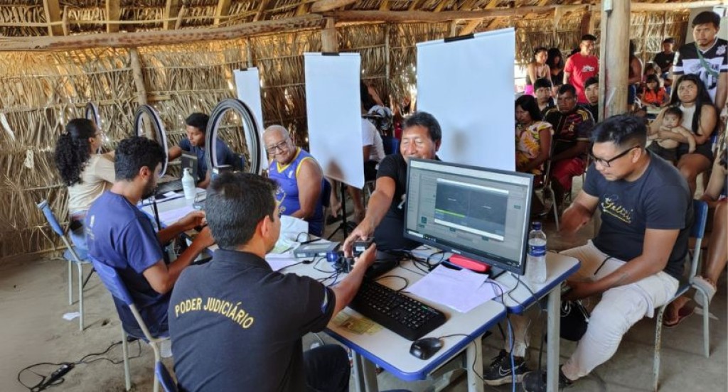 #PraTodosVerem – A imagem mostra um mutirão de cadastramento biométrico realizado dentro de um barracão de palha, onde servidores da Justiça Eleitoral atendem indígenas em mesas com computadores e equipamentos de coleta digital. Ao fundo, diversos indígenas aguardam sentados, enquanto outras passam pelo atendimento, evidenciando a organização da comunidade para participar do processo.