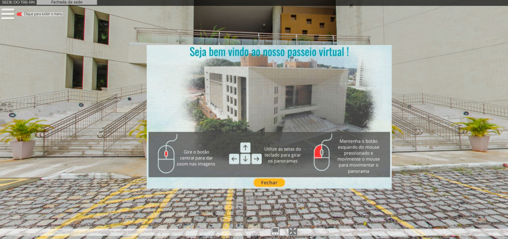#PraTodosVerem: A imagem mostra a tela inicial de um passeio virtual da sede do Tribunal Regional Eleitoral do Rio Grande do Norte (TRE-RN). Em destaque, aparece uma mensagem de boas-vindas acompanhada de instruções sobre como navegar pelo tour, utilizando o mouse e o teclado para movimentar e dar zoom nas imagens. Ao fundo, é possível ver a fachada do prédio do tribunal, com escadarias, rampas de acesso e vasos com plantas, compondo a entrada principal da instituição.