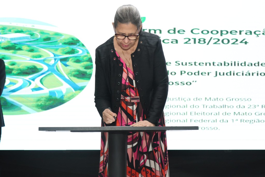 #PraTodosVerem: Foto que mostra a presidente do TRE-MT, de pé, com um vestido longo estampado, um casaco social preto por cima, cabelos pretos presos. Ela está com uma mão apoiada em uma mesa e a outra segurando uma caneta, preparando para a assinatura do termo. Atrás dela, aparece um telão com o assunto do termo de cooperação sendo projetado. Ao final da matéria, tem mais fotos do evento na galeria.
