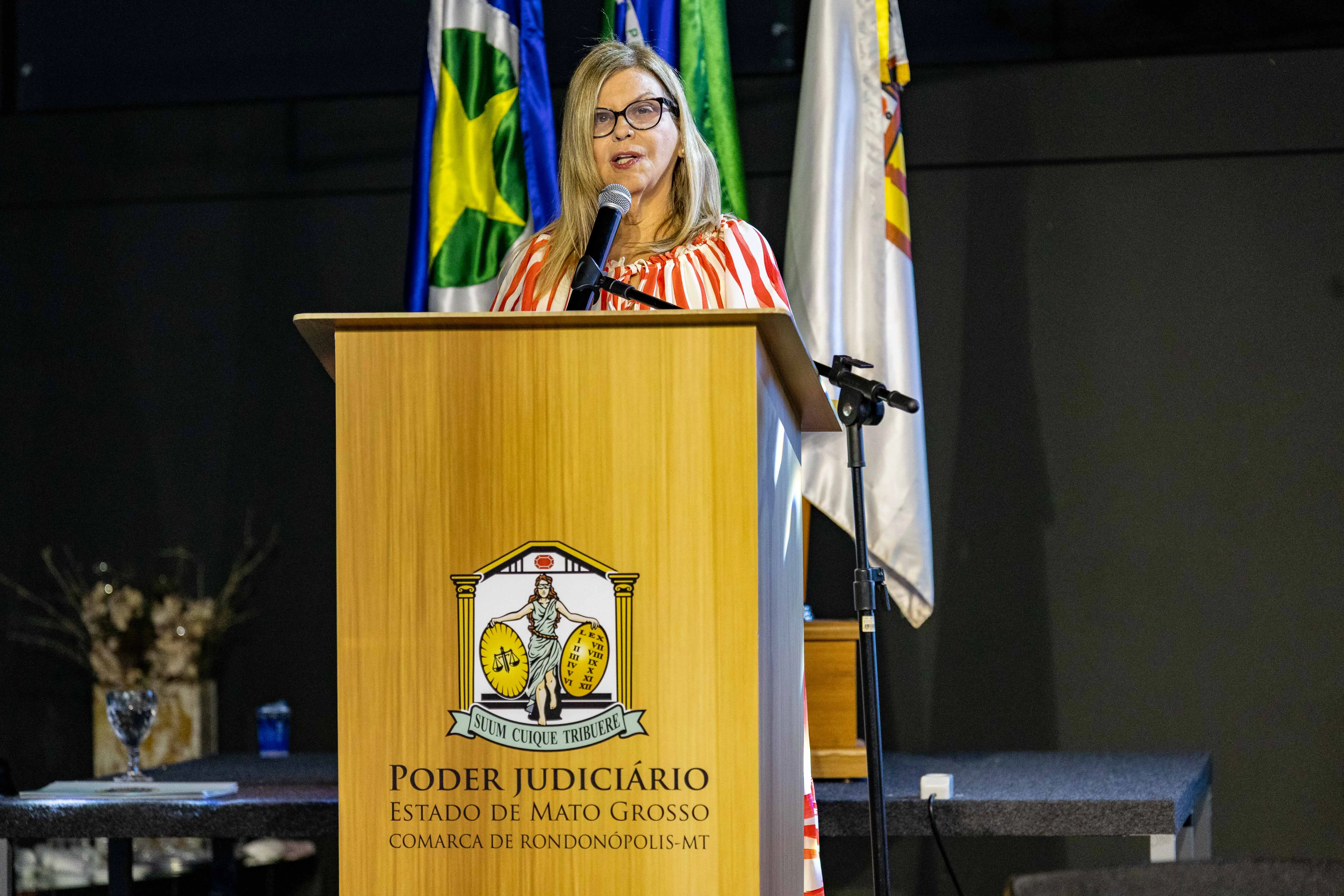 Juíza Ranata Evaristo tem cabelos longos e escuros fala ao microfone em púlpito de madeira, com bandeiras coloridas ao fundo. Ela sorri, usa vestido azul-marinho e colar dourado, em ambiente iluminado.Para a juíza Renata do Carmo Evaristo Parreira, coordenadora da Comissão Permanente de Acessibilidade e Inclusão do TJMT, o evento demonstra o papel institucional do Judiciário na promoção da cidadania e da dignidade da pessoa humana.